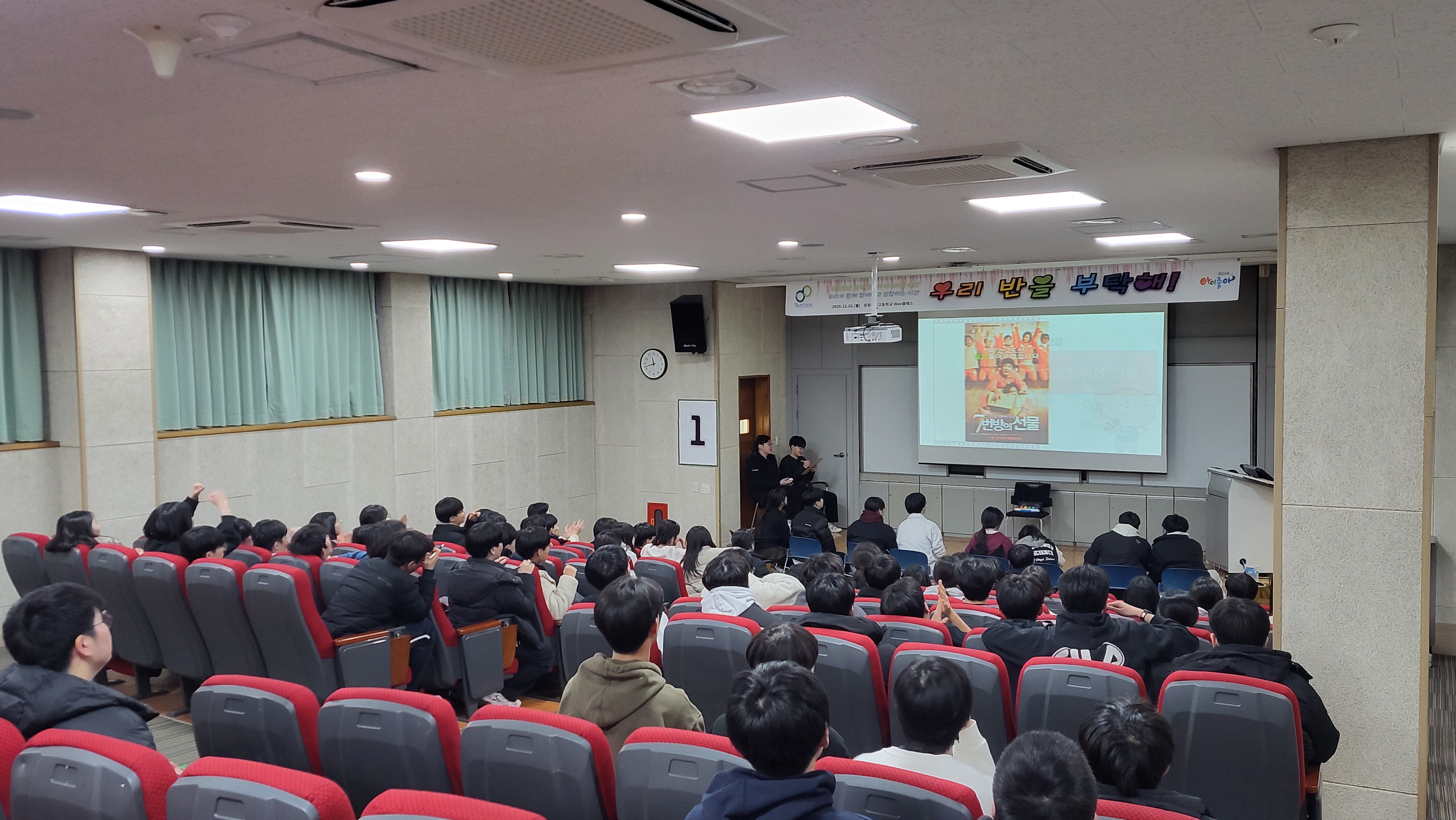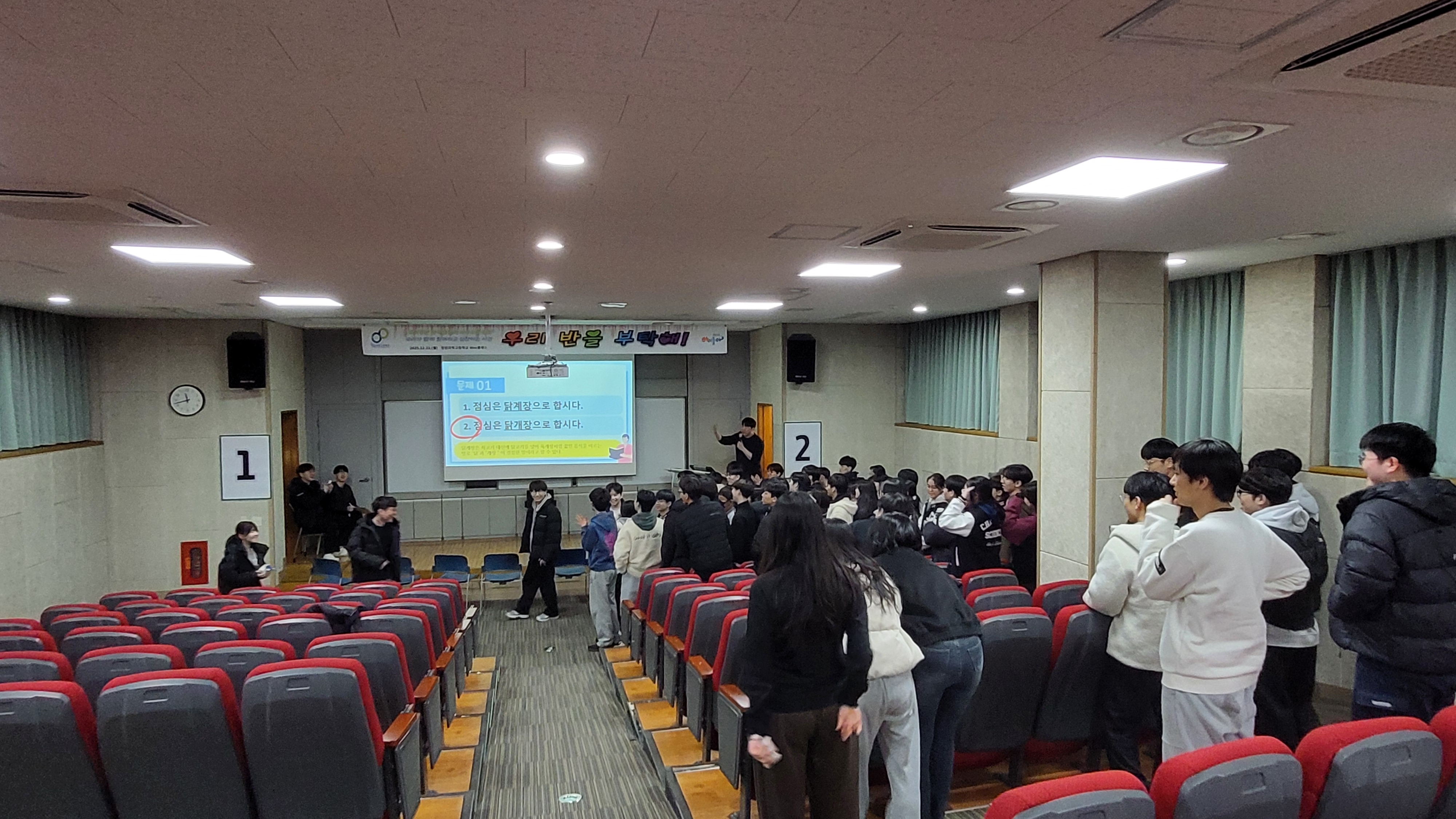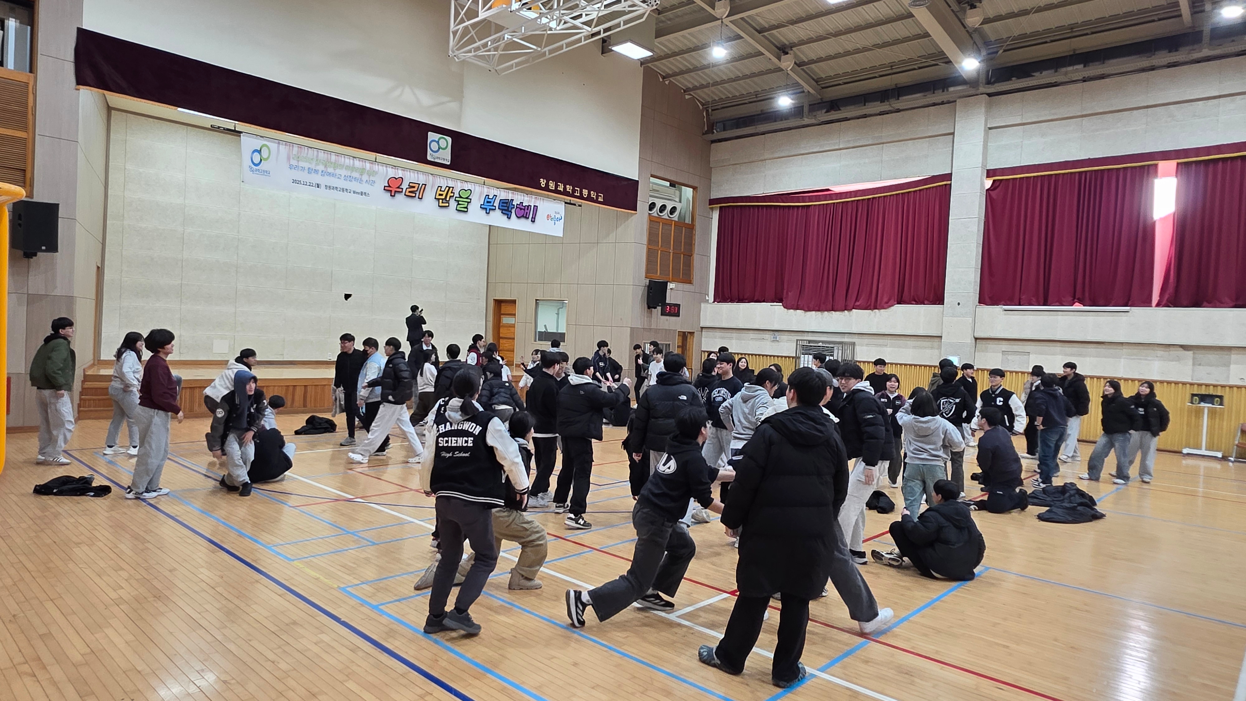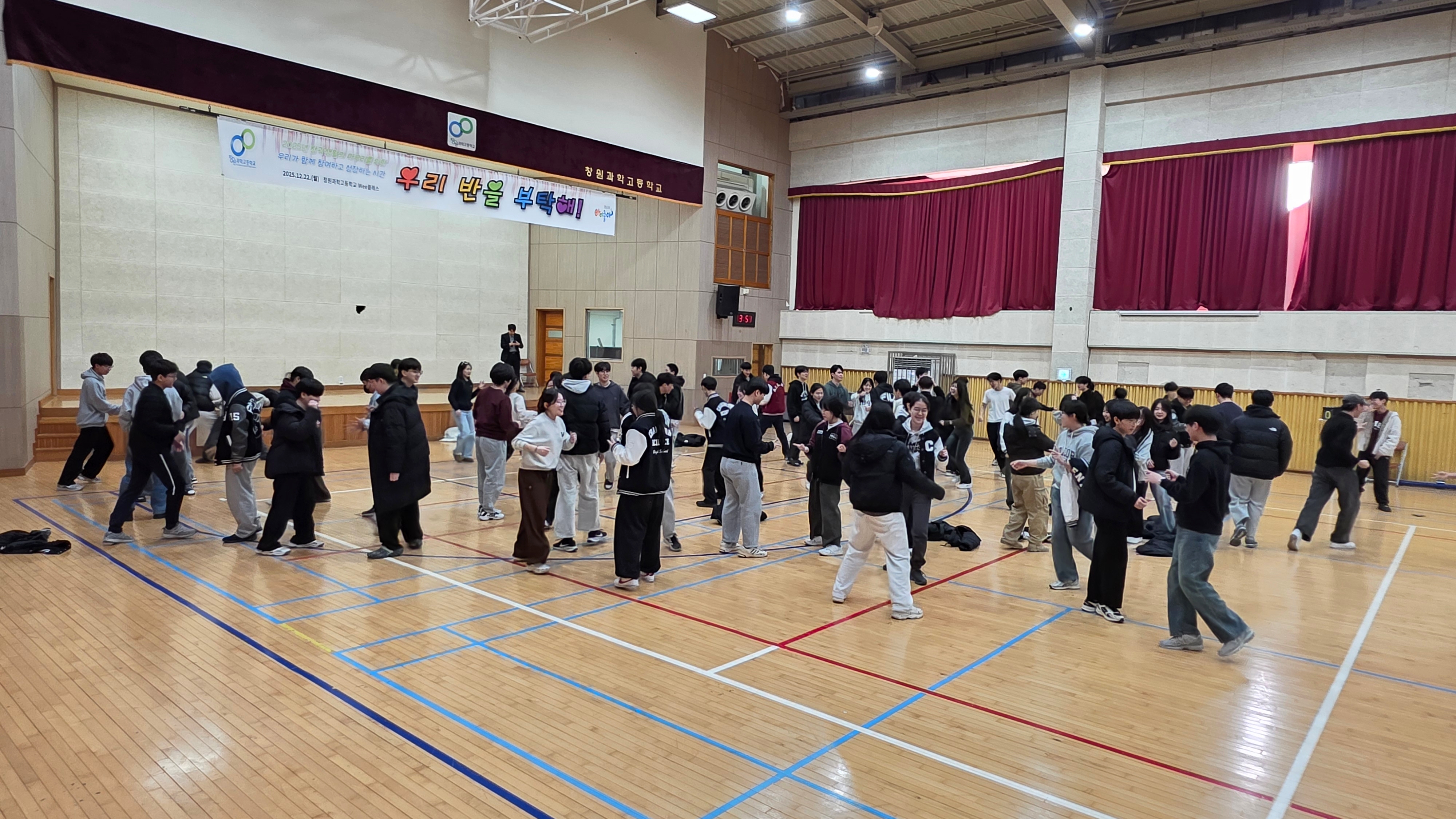 일시: 2025.12.22.(월) 15:30~7:30, 18:40~21:10 장소: 체육관 및 소강당 대상: 1학년 내용: 팀빌딩 프로그램, 뇌섹창곽(학급퀴즈 대항전)