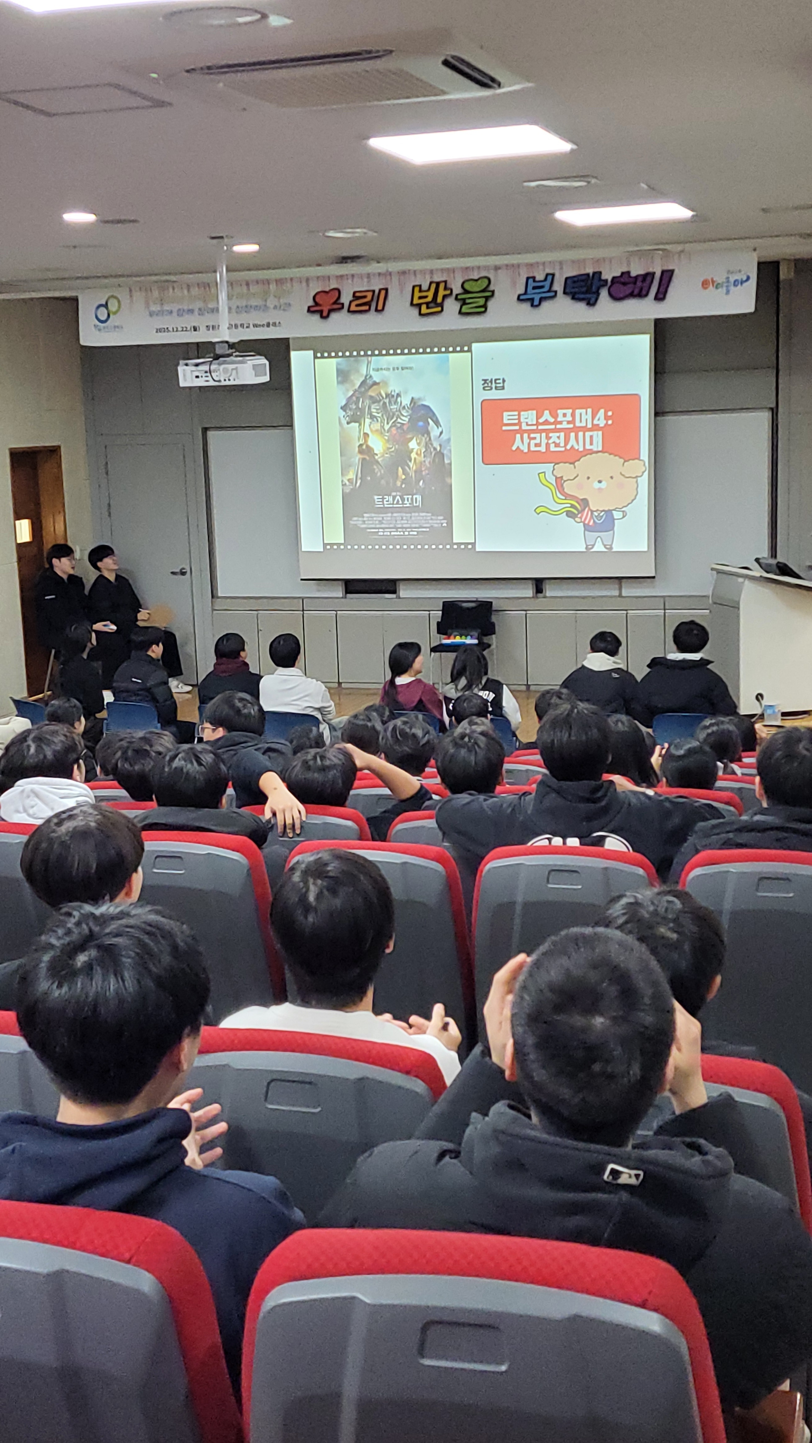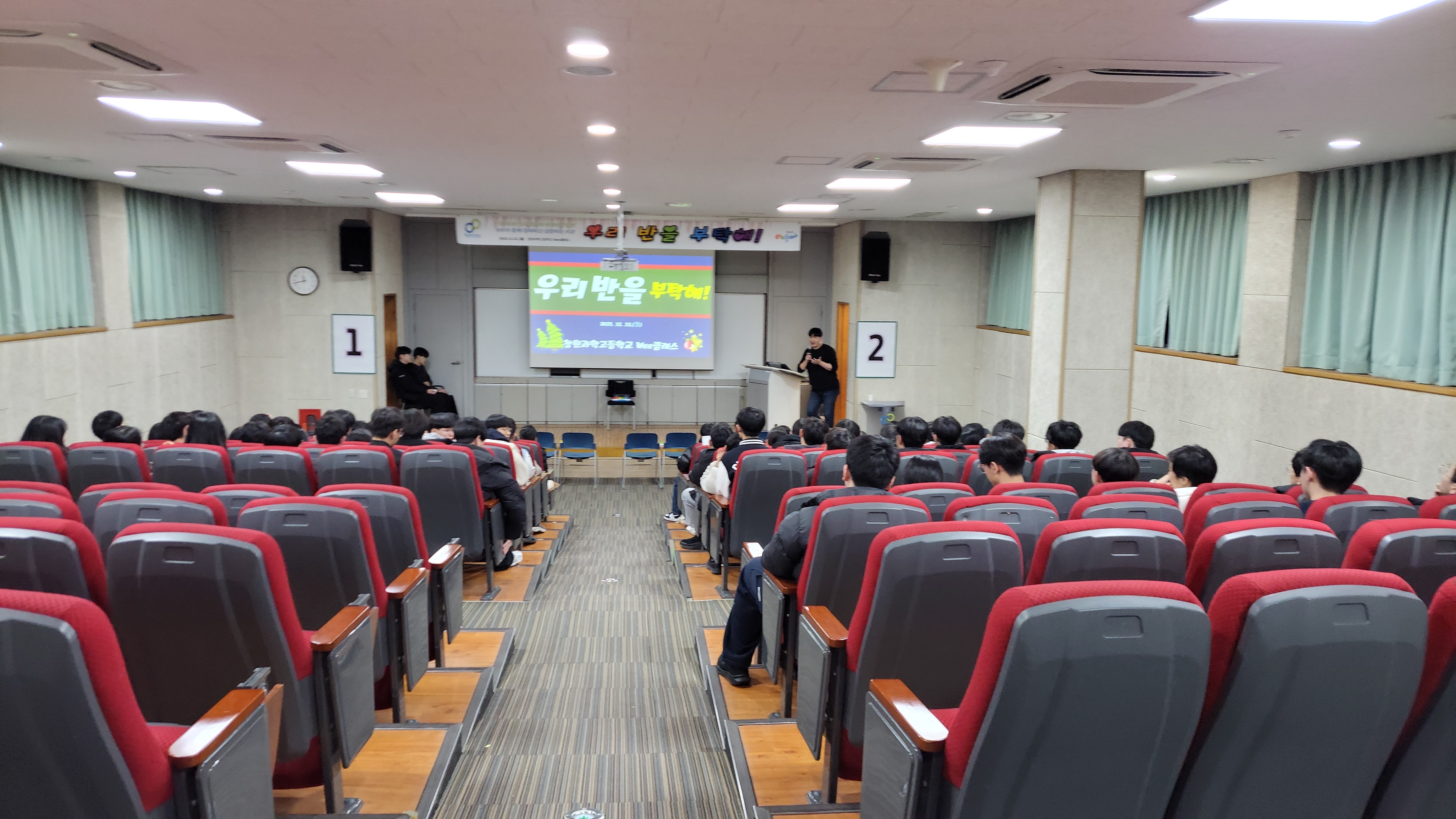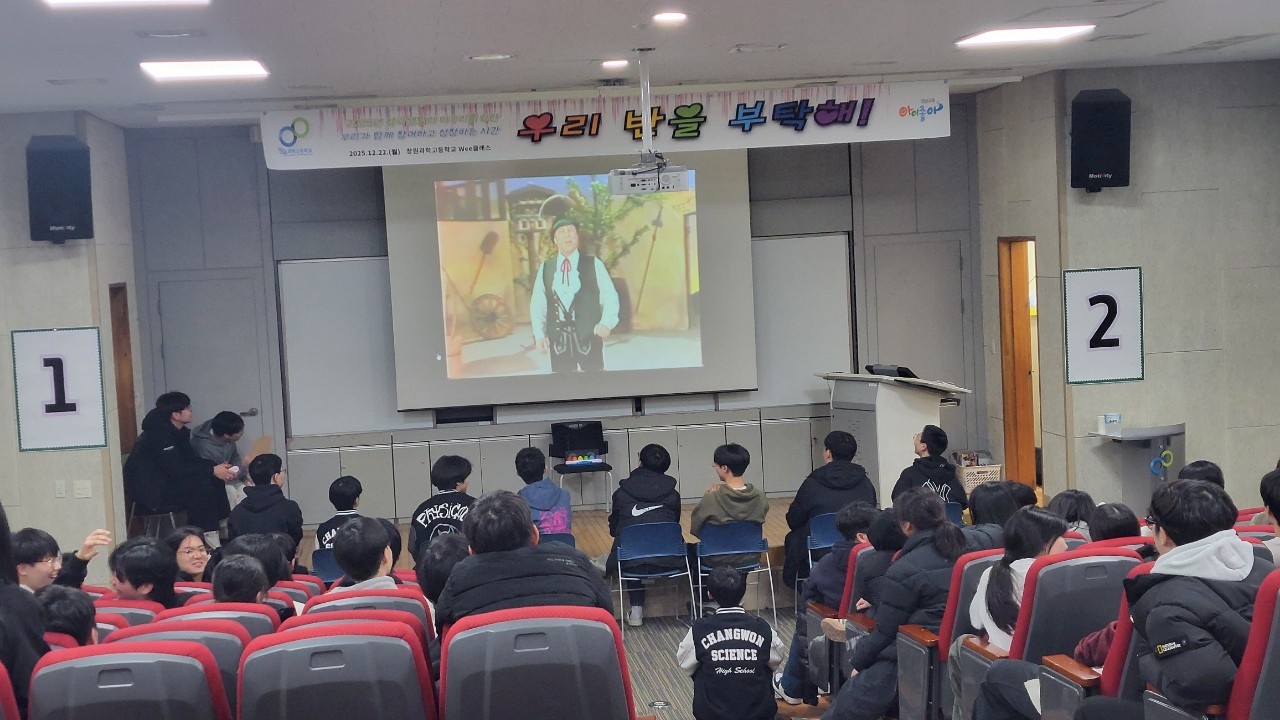 일시: 2025.12.22.(월) 15:30~7:30, 18:40~21:10 장소: 체육관 및 소강당 대상: 1학년 내용: 팀빌딩 프로그램, 뇌섹창곽(학급퀴즈 대항전)