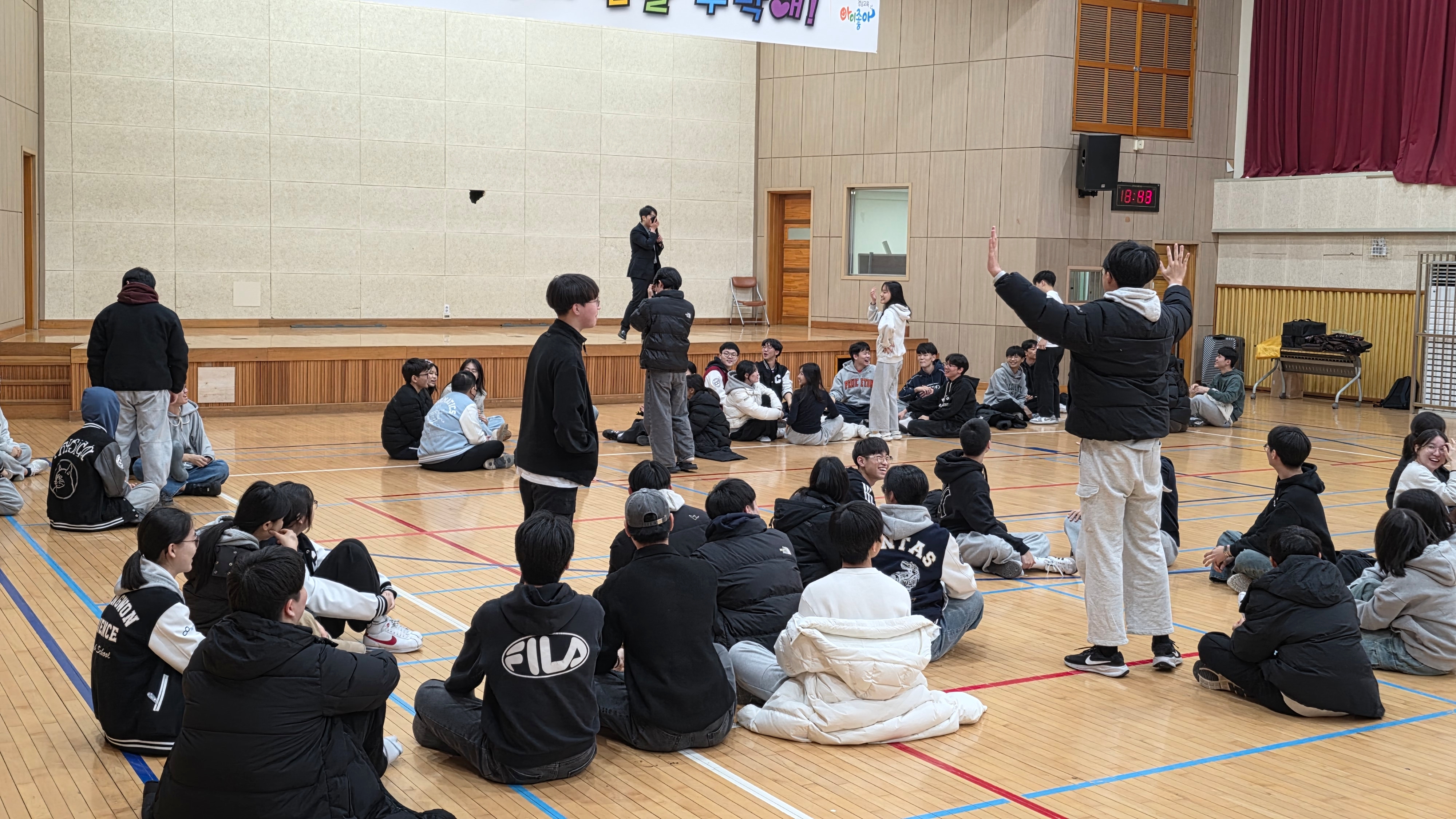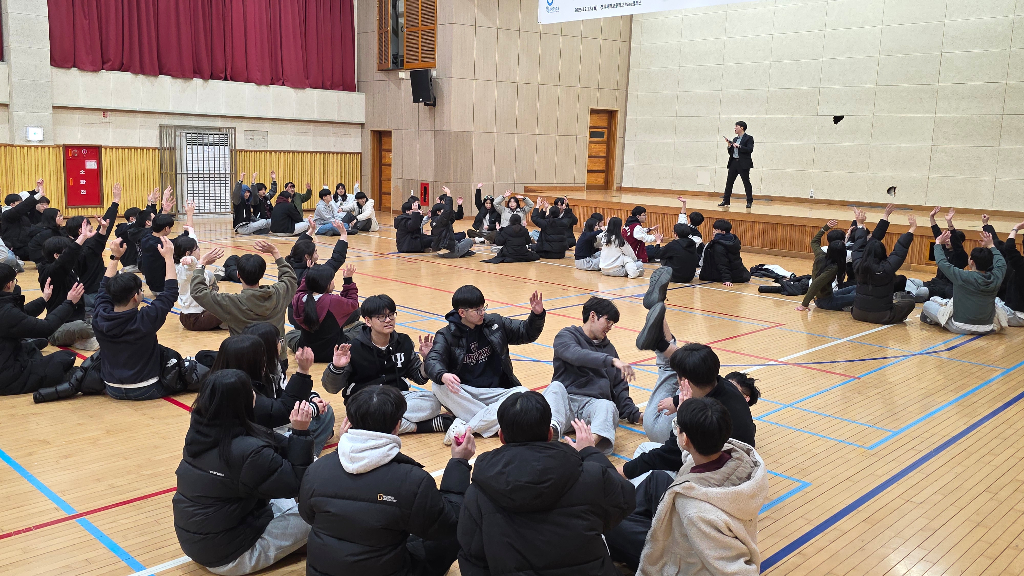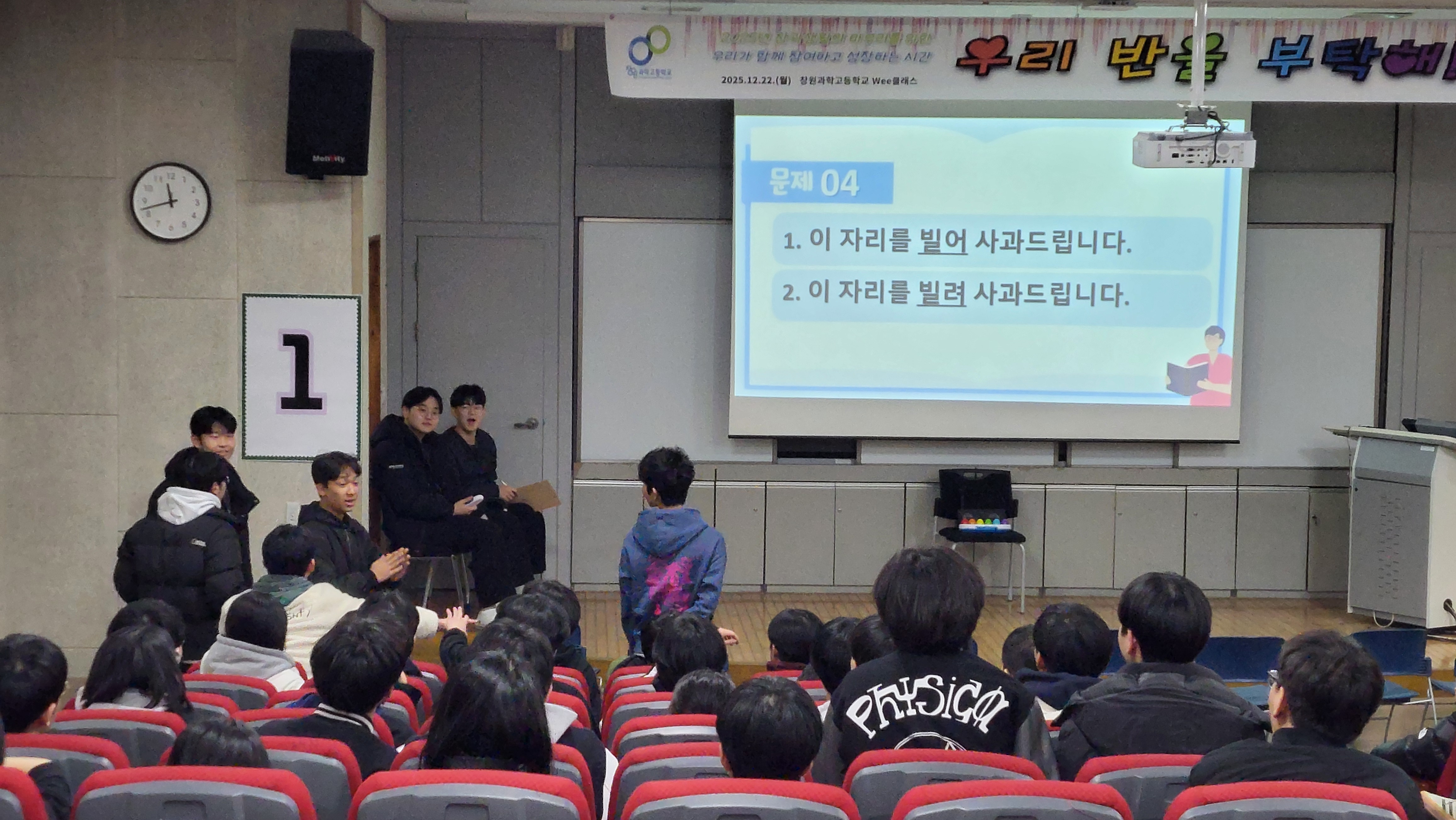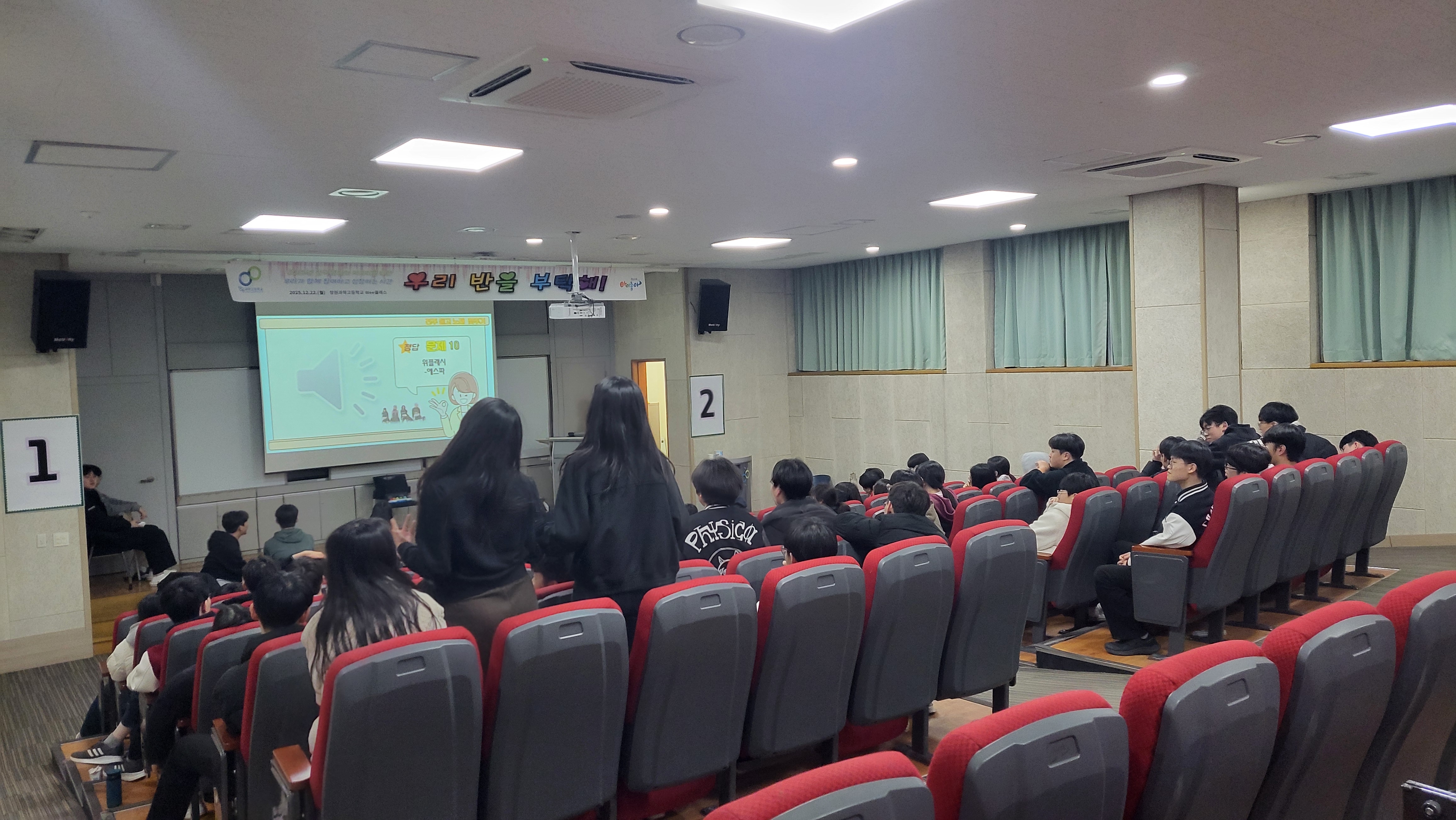 일시: 2025.12.22.(월) 15:30~7:30, 18:40~21:10 장소: 체육관 및 소강당 대상: 1학년 내용: 팀빌딩 프로그램, 뇌섹창곽(학급퀴즈 대항전)