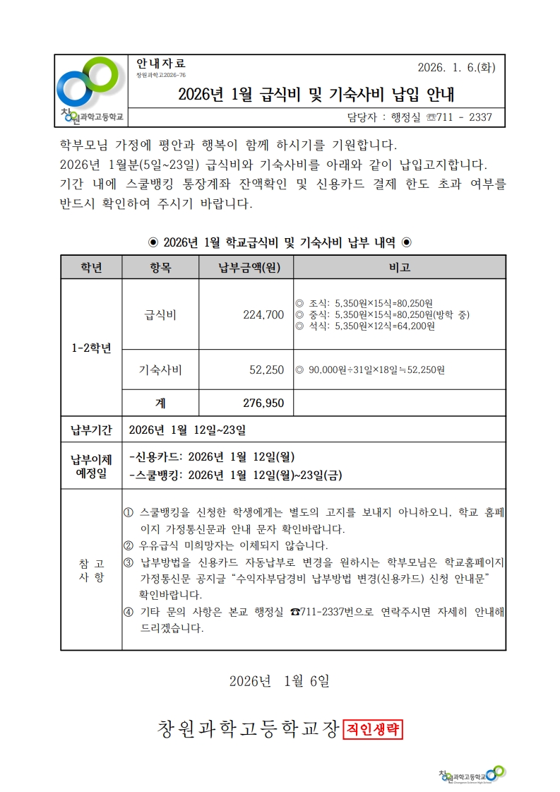 2026년 1월 급식비 및 기숙사비 납입 안내